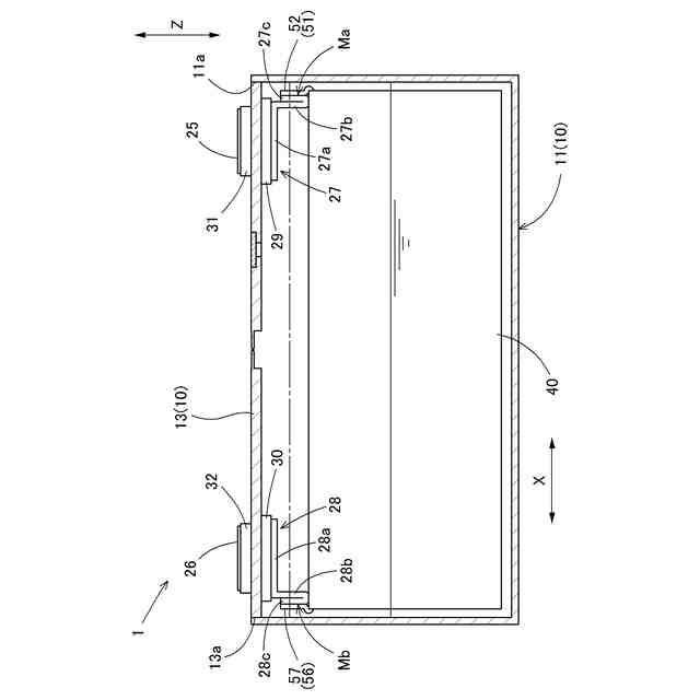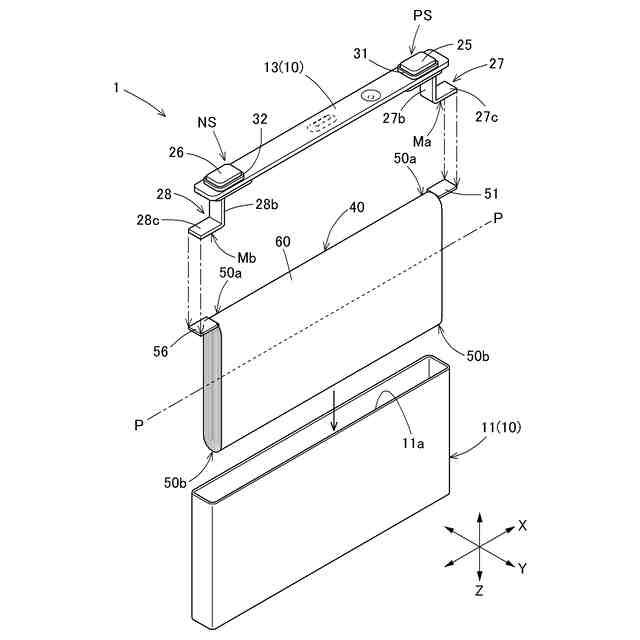 【解決手段】筐体11と蓋体13と電極体40と電池端子PS,NSとを備えた二次電池1であって、電極体40は、捲回軸方向における少なくとも一方端の上部に円弧部50aを有しており、当該円弧部50aから正極材又は負極材のタブが積層されてなるタブ群51,56が延出しており、捲回軸が水平となるように筐体11の内部に収容されており、電池端子PS,NSは、電極体40のタブ群51,56と接合される接合面Ma,Mbを先端部に有した集電端子27,28を有しており、タブ群51,56と集電端子27,28とは、接合面Ma,Mbにタブ群51,56が接合された状態で、蓋体13と電極体40との間の空間に位置している。