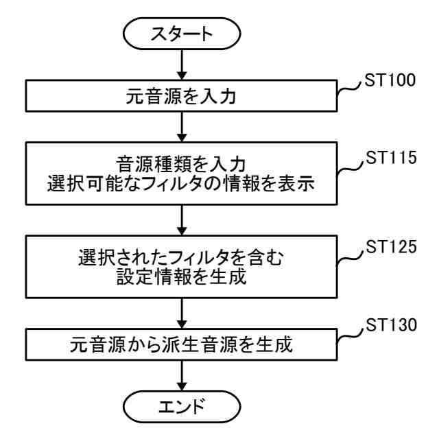1つの前記元音源から1つの前記派生音源を生成するために使用される1つの前記フィルタの前記フィルタ構成情報を追加する指示が入力されると、当該指示に応じた前記フィルタ構成情報を当該1つの元音源の前記設定情報に追加し、当該指示に応じた前記フィルタ構成情報に基づいて構成される当該1つのフィルタにより、当該1つの元音源の音響データを当該1つの派生音源の音響データへ変換する工程を有する、