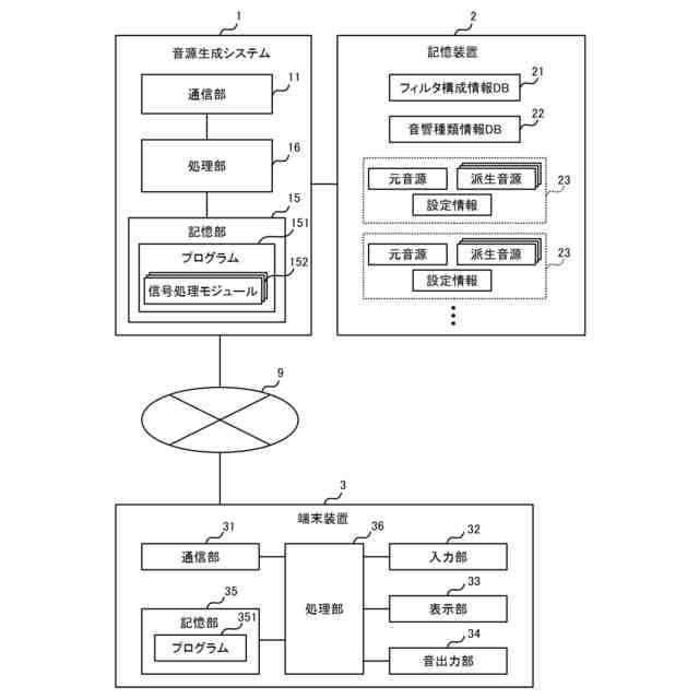 本発明の第4の態様は、元音源から複数の派生音源を生成する音源生成システムであって、記憶装置にアクセス可能であり、記憶装置は、複数のフィルタ構成情報と、複数の音源種類情報とを記憶しており、1つのフィルタ構成情報は、元音源の音響データを派生音源の音響データに変換する1つのフィルタの構成に関する情報を含み、元音源の種類を音源種類と呼び、1つの音源種類情報は、1つの音源種類の元音源から複数の派生音源を生成するために使用される複数のフィルタに関する情報を含み、1つの元音源の音源種類を設定する指示が入力されると、当該指示に応じた1つの音源種類の音源種類情報に基づいて、当該1つの元音源から複数の派生音源を生成するために使用される複数のフィルタに関する情報を含んだ設定情報を生成する手段と、1つの元音源について派生音源を生成する指示が入力されると、当該1つの元音源の設定情報に基づいて、派生音源の生成に使用される複数のフィルタのフィルタ構成情報を取得し、取得した複数のフィルタ構成情報に基づいて構成される複数のフィルタにより、当該1つの元音源の音響データを複数の派生音源の音響データへ変換する処理を行う手段とを有する、音源生成システムである。