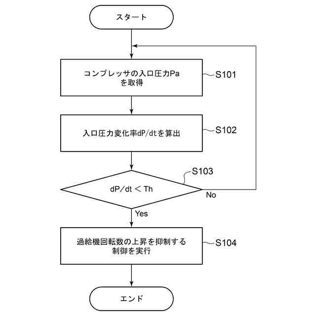特許文献1に記載の上記方法では、例えばエンジンの高回転数領域でコンプレッサのサージングが発生した場合や複数の過給機の中の1台の過給機でサージングが発生した場合等には、過給機の回転数が瞬時に上昇するため、ウェイストゲートバルブを開放させる制御が間に合わず、過給機の過回転が発生してしまう懸念がある。したがって、過給機の過回転の発生を抑制するために、過給機の過回転の予兆であるコンプレッサのサージングの発生を早期に検知する必要がある。