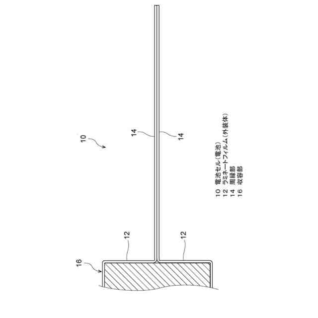 第2の態様の発明によれば、周縁部が、電極体を内部に収容した収容部の厚み方向外側へはみ出ていない。したがって、複数の電池が厚み方向に並べられて収容されるときに、精度よく並べられる。