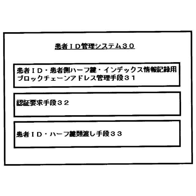 患者ログインIDに紐づく(保険証番号やマイナンバー情報等が紐づく)患者ID、患者側暗号用・復号用の夫々のハーフ鍵及びインデックス情報記録用ブロックチェーンアドレスを管理する患者ID・患者側ハーフ鍵・インデックス情報記録用ブロックチェーンアドレス管理手段と、