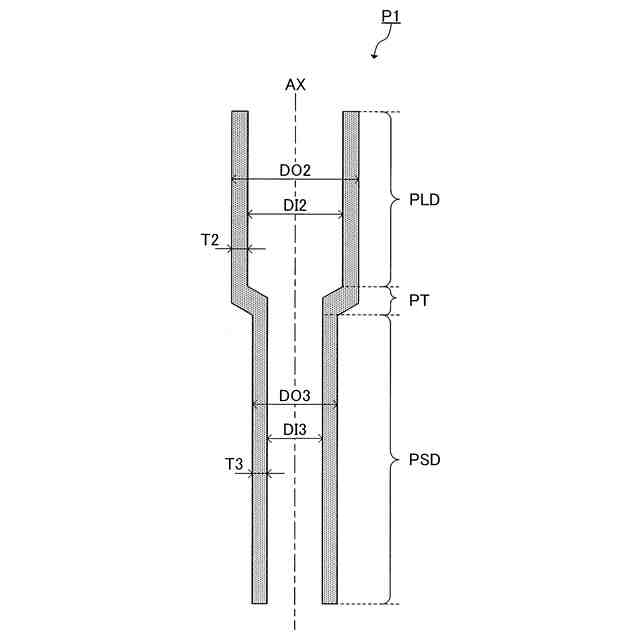 前記筒状部材は、前記小径部よりも前記第2先端側に形成され且つ前記第3外径に等しい第10外径、前記第3内径よりも小さい第9内径及び前記第3肉厚よりも大きい第5肉厚を有する円筒状の部分である厚肉部と、前記小径部と前記厚肉部との間に形成され且つ前記小径部から前記厚肉部へと近付くにつれて前記第3内径から前記第9内径へと内径が減少し且つ前記第3肉厚から前記第5肉厚へと肉厚が増大する部分である肉厚増大部と、を更に含み、