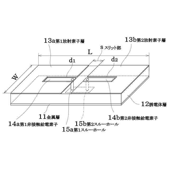 本発明は、金属層の上面(片面)に一つの誘電体層を介して、放射素子層の一部を切り欠いて非接触給電素子を概ね面一に配置した点に特徴がある。