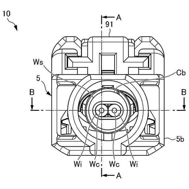 【解決手段】コネクタ10は、芯線Wcを結線する一対の端子1・1と、一対の端子1・1を保持した内部ハウジング2と、一対の電線W・Wの露出部を密着可能に覆う金属シェル3と、金属シェル3と直列に接続したカバーシェル4と、を備える。電線Wの絶縁被覆露出部が導入される端子導入孔部32の内孔が分割されることで、一対の端子導入孔32h・32hを圧着部31よりも細く外縁の一部が連通した「無限の記号」状に形成しているので、電線Wの絶縁被覆Wiが端子導入孔32hの内壁に密着している。従って、高周波帯域での良好な信号伝送が可能となる。