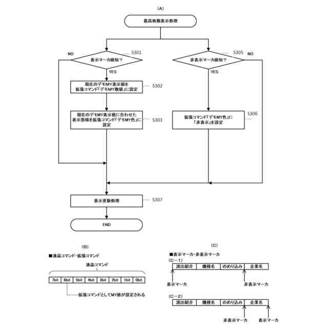 (A)は、本発明の一実施形態に係るスロットマシンのデモ画面表示における最高枚数表示処理の流れを示すフローチャートであり、(B)は、本発明の一実施形態に係るスロットマシンの液晶コマンドの構成を説明する図であり、(C)は、本発明の一実施形態に係るスロットマシンの表示マーカ及び非表示マーカを説明する図である。