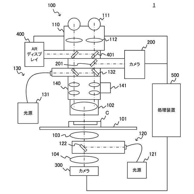 【解決手段】透過照明光源121を含み、透過明視野観察法による接眼レンズ111からの対象物の観察が可能である第1光学系と、少なくとも一部の光学系を第1光学系と共用し、対象物についての接眼レンズ111からの観察とは異なる観察が可能である第2光学系と、少なくとも異なる観察によるデジタル画像を、第2光学系を介して取得するカメラ300と、カメラ300により第2光学系を介して取得されたデジタル画像に対して物体検出を行い、物体検出の結果の情報を含む補助情報を出力する処理装置500と、第1光学系の光軸上に形成される透過明視野観察法による光学画像に、補助情報を重ねるARディスプレイ400と、を顕微鏡システム1が備える。