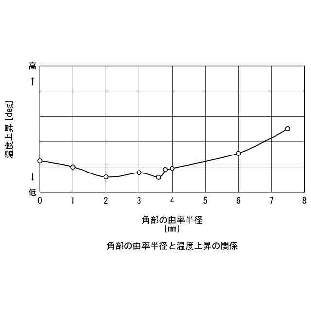 第1実施形態の曲率半径とバスバーの温度上昇との関係を示す図。