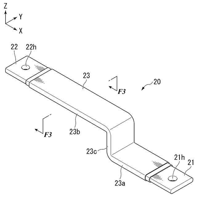本開示では、X方向、Y方向、およびZ方向は、以下のように定義される。X方向は、後述するバスバー20の第1延伸部23aの延伸方向である。Y方向は、バスバー20の第1延伸部23aの幅方向である。Z方向は、バスバー20の第1延伸部23aの厚さ方向である。なお以下の説明における水平方向および上下左右は、バスバー20の使用状態(例えば車両Vへの搭載状態)における姿勢を基準としている。