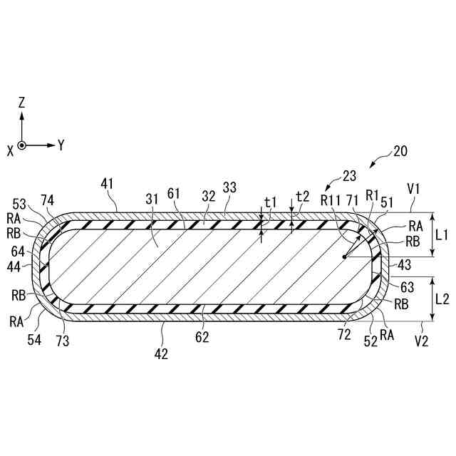 前記延伸部は、前記延伸部の厚さ方向で前記第1主面とは反対側に位置して前記第1主面と平行な第2主面と、前記第1側部と前記第2主面とを繋ぐ第2角部とを有し、
