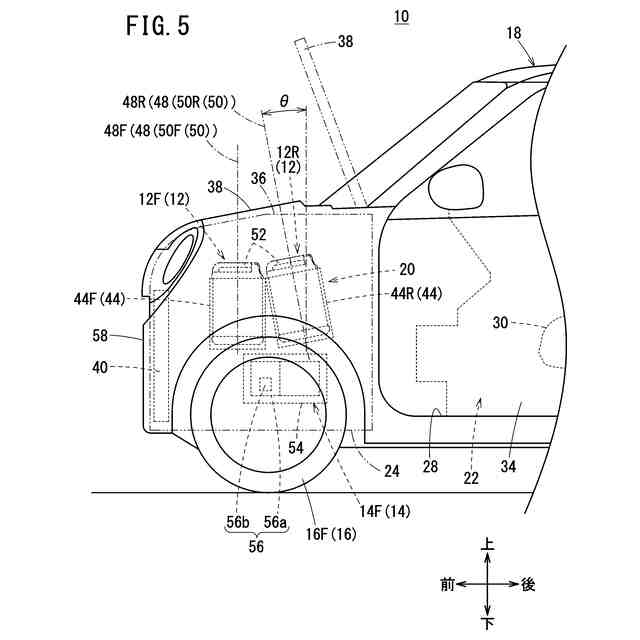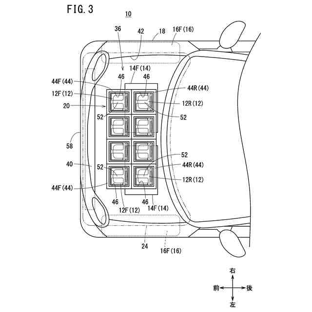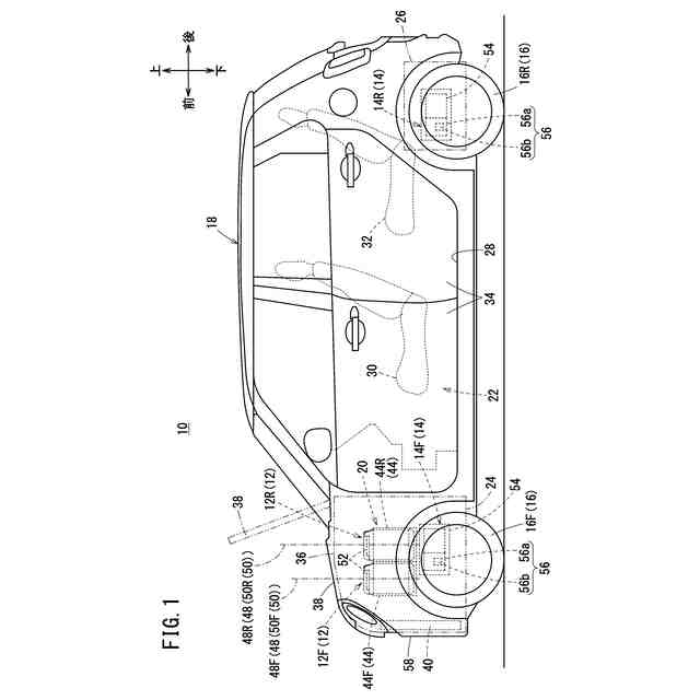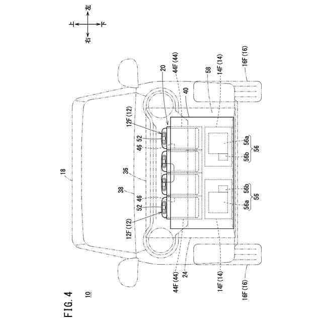 車両10は、モバイルバッテリ12(蓄電装置)の電力によって駆動するモータユニット14(電動機)を備えた電気自動車(EV)である。車両10は、前方の車輪16である2つの前輪16Fと、後方の車輪16である2つの後輪16Rとを備える四輪の電動車両である。車両10は、2つの前輪16Fと2つの後輪16Rとがそれぞれ回転することで走行する四輪駆動(4WD)の電気自動車である。