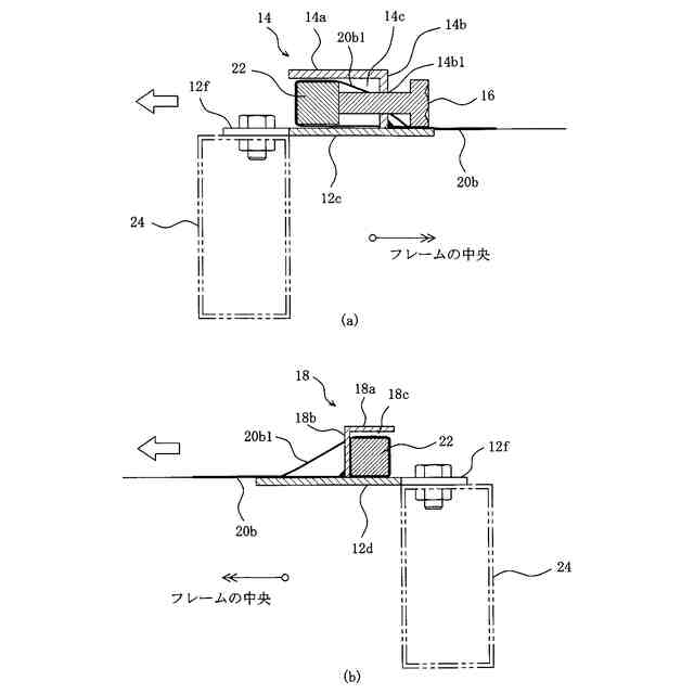 前記第1ブラケットが各々、前記取り付けられた前記左側部材又は前記右側部材と平行に配置された第1部分、および前記第1部分の前記フレームの中央の側に位置する端に前記第1部分と直交するように配置された第2部分を有し、前記第1部分、前記第2部分および前記取り付けられた前記左側部材又は前記右側部材によって凹所が形成されており、