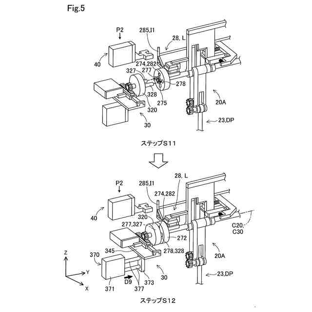ローラ11,12は、回転することで無端連鎖部材15を移動させる。第1ローラ11は、第1回転軸A1を中心として回転する。第2ローラ12は、第2回転軸A2を中心として回転する。第1回転軸A1と第2回転軸A2とは平行である。第1ローラ11と第2ローラ12とは、カセット20の搬送方向D1,D2に沿った方向において離間して配置される。第1ローラ11は、第1場所P1に配置される。第2ローラ12は、第2場所P2に配置される。