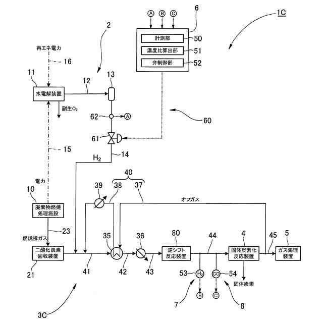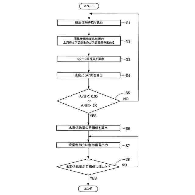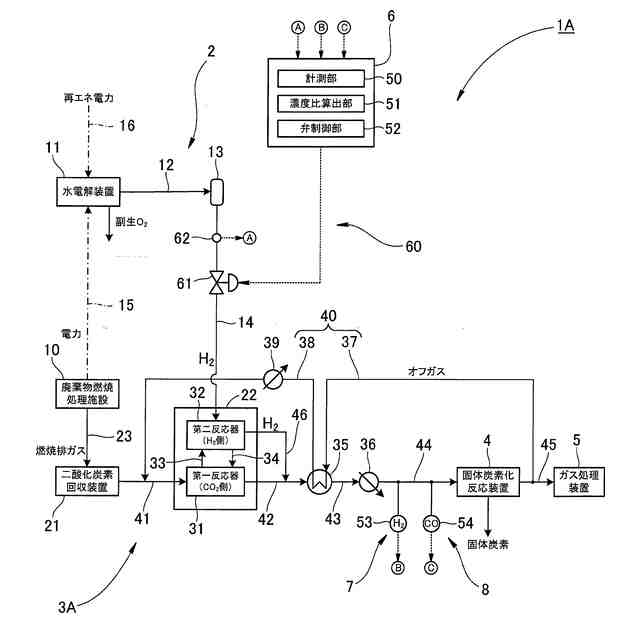 【解決手段】水素を供給する水素供給手段2と、一酸化炭素を生成する一酸化炭素生成手段3Aと、一酸化炭素の還元及び酸化を行う触媒を有し、水素供給手段2から供給される水素、及び一酸化炭素生成手段3Aで生成した一酸化炭素を含むガスが導入され、触媒の作用により固体炭素を析出する固体炭素化反応装置4と、固体炭素化反応装置4に導入されるガスに含まれる水素の濃度(A%)と当該ガスに含まれる一酸化炭素の濃度(B%)との濃度比(A/B)を算出する濃度比算出手段と、濃度比算出手段によって算出される濃度比(A/B)が0.05~2.0となるように水素供給手段2を制御する制御手段60とを備えるものとする。