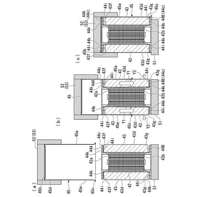 このものにおいて、マグネットにおける回転軸線方向の両端面の位置は、ステータコアにおける回転軸線方向の両端面と同一平面上又はこの両端面よりも回転軸線方向の外側に位置している。ロータコアの軸受とは反対側の端面の位置は、マグネットの軸受とは反対側の端面の位置よりも軸受側に位置している。ロータコアにおける軸受側の端面の位置は、マグネットにおける軸受側の端面の位置よりも軸受側に位置している。