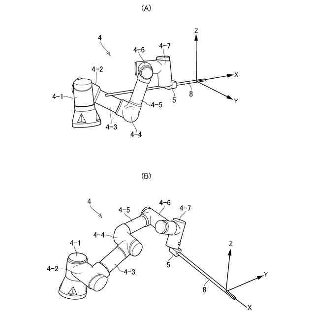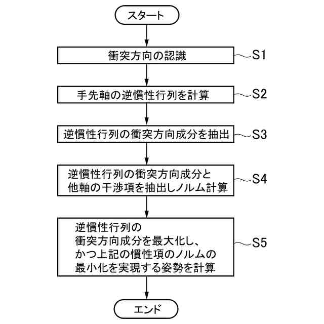 本発明においては、前記手先部は、手先軸を有する関節部によって保持され、前記姿勢算出部は、前記手先軸の逆慣性行列を演算し、前記逆慣性行列の前記外力が作用する方向の成分を抽出し、前記逆慣性行列の前記外力が作用する方向の成分と前記手先軸以外の関節部における回転軸との干渉項を抽出してノルムを計算し、前記逆慣性行列の前記外力が作用する方向の成分を最大化するとともに前記ノルムを最小化する姿勢を計算するように構成されていてよい。