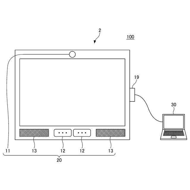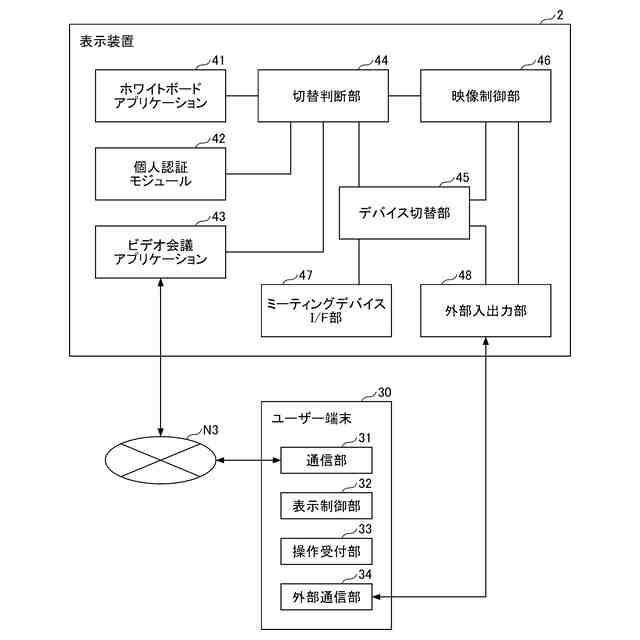図1は、表示装置2とユーザー端末30を用いた通信システム100の概略構成を示す。表示装置2には、カメラ11、マイク12及びスピーカー13が内蔵又は外付けされている。以下、カメラ11、マイク12及びスピーカー13をミーティングデバイス20という。表示装置2は、ネットワークを介して他の拠点の表示装置2と通信できる。表示装置2はタッチパネルへの手書き入力だけでなく、ミーティングデバイス20が取得した画像データ及び音声データの少なくとも一方を他の拠点の表示装置2に送信できる。他の拠点の表示装置2は、受信した手書き入力を表示し、画像データ及び音声データを出力する。したがって、遠隔地の各拠点に存在するユーザーが遠隔コミュニケーションを行うことができる。