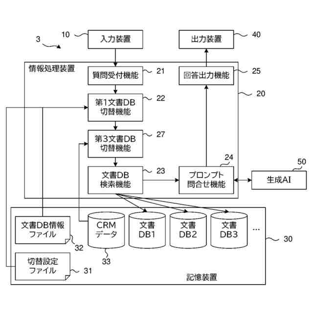生成AI(Artificial Intelligence)が対話システムに用いられる場合、生成AIが、事実とは異なる内容や、文脈と無関係な内容を出力するハルシネーションが課題となっている。この課題に対して、生成AIと検索システムとを組み合わせることで、専門知識や最新知識を反映させた回答を生成するRAG(Retrieval Augmented Generation)という技術が提案されている。ところで、製品は、名称が同じであっても、例えば製造年によって仕様が異なることがある。このため、RAGを用いたとしても、製品に関する問い合わせに対する回答が不正確になる可能性があるという技術的問題点がある。