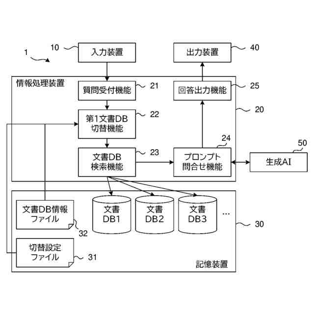 前記指定されたデータベースを用いた検索の検索結果と、前記質問とに基づいて、生成AIに入力されるプロンプトを生成する生成手段と、