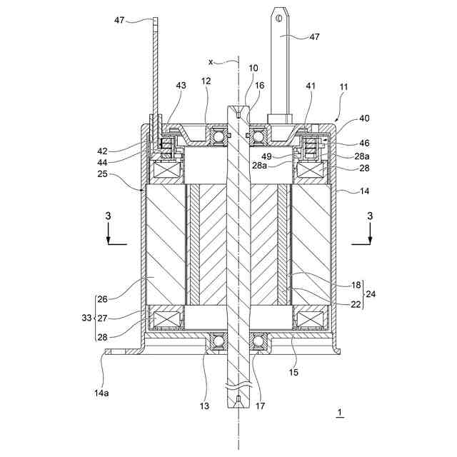 図1~図3を併せて参照すると、モータ1は、例えば軸線xを中心軸線とする円柱状のシャフト10を備えている。シャフト10は、ハウジング11に固定される2つの軸受12、13に回転自在に支持されている。軸受12、13は、シャフト10とハウジング11との間に例えば圧入などにより取り付けられている。軸受12、13は例えば玉軸受である。この例では、シャフト10は、ハウジング11の上端から上側よりも、ハウジング11の下端から下側により大きく突出している。