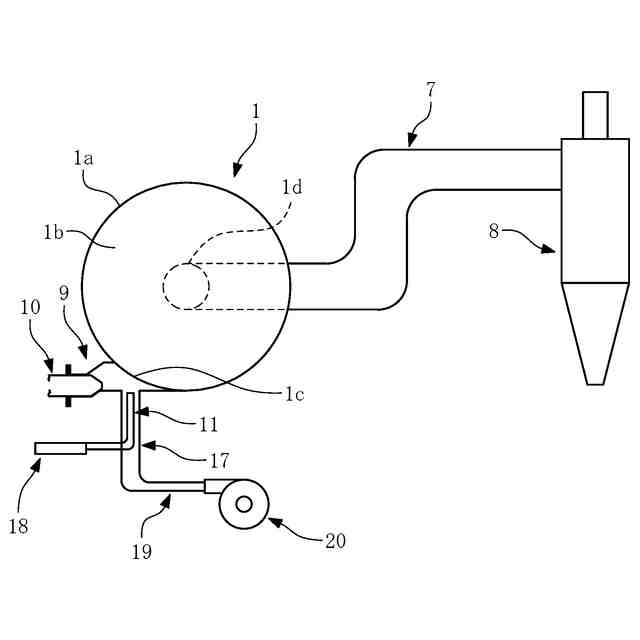 しかしながら、蒸気ジェット噴射装置は、処理槽1、導管7、サイクロン8の構成から処理槽1内の圧がやや陽圧になっているため、処理槽1内から噴入管2等の方向(外方向)に押し出そうとする圧力が生じ、高温気体送風管4から高温気体を処理槽1に供給する際には、処理槽1の内圧よりも高圧で吹き込み得るように大型で高価なバーナ5及びブロア6を用いる必要があった。
