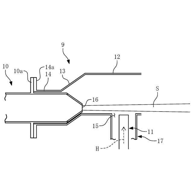 ここで蒸気噴射ノズル3は、噴入管2の中心軸線と同軸になるように横方向から噴入管2内に向かう構成を備え、超音速の蒸気は、外部から噴入管2内の軸線に向かって噴射されるようになっている。また高温気体送風管4は、噴入管2の中心軸線とほぼ直角になるように下方向から噴入管2に向かう構成を備え、高温気体は、噴入管2内に下方から上方へ噴入管2の径方向に向かって吹き込まれるようになっている。