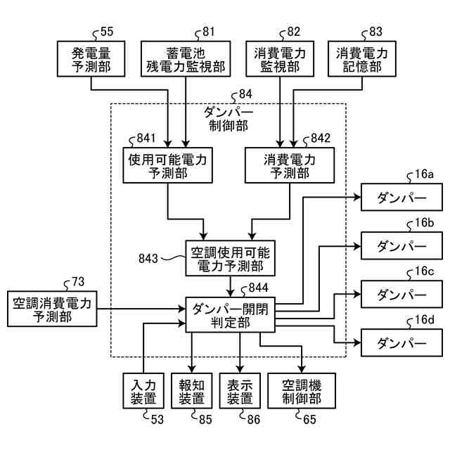 前記蓄電池の残電力量および前記発電量予測部で予測された前記発電量と、前記複数の部屋を有する建築物内での前記空調機以外での消費電力量の予測値と、から前記決められた期間において買電することなく空調で使用可能な電力量を算出し、前記決められた期間および前記空調で使用可能な電力量の範囲で、前記複数の部屋のうち予め決められた部屋を含む少なくとも1つの部屋で前記決められた期間において空調を継続することができるように前記ダンパーの開閉を制御するダンパー制御部と、