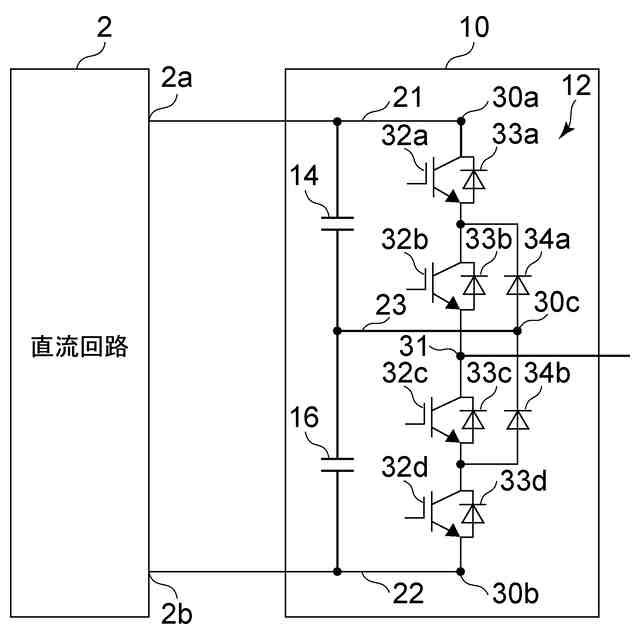 正電位端子と負電位端子とを有し、前記正電位端子と前記負電位端子との間の直流電力の別の電力への変換、及び前記別の電力の前記直流電力への変換の少なくとも一方を行う変換器と、