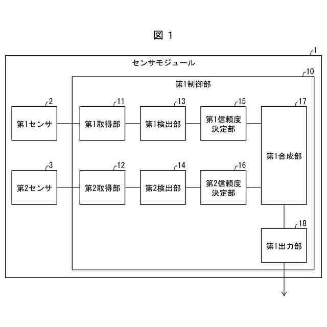 【解決手段】センサモジュール(1)は、第1センサ(2)の検出パラメータに応じて、検出結果の第1信頼度を決定する第1信頼度決定部(15)と、第2センサ(3)の検出パラメータに応じて、検出結果の第2信頼度を決定する第2信頼度決定部(16)と、第1信頼度と第2信頼度とを合成した第1合成信頼度を決定する第1合成部(17)と、を備える。