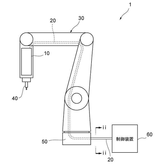 上記課題を解決するために、信号線と、円筒状の絶縁材料によって形成されており、かつ前記信号線の外周面を覆うように設けられる絶縁層と、前記絶縁層の外周面を覆うように、かつ前記信号線及び前記絶縁層と同軸的に設けられるとともに、ロボットに搭載された近接センサに電力を供給する円筒状の電力線と、を備える。