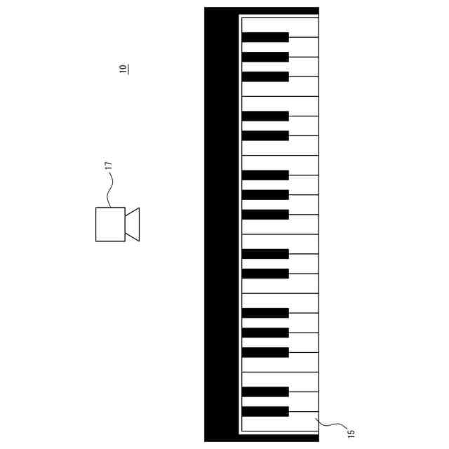 図1は、端末装置10の構成例を示す。本実施形態において、端末装置10は鍵盤楽器である。端末装置10としての鍵盤楽器は、ユーザによる操作を受け付ける操作部15としての鍵盤と、鍵盤に画像を投影する投影部17とを備える。これに限られず、端末装置10は、操作部15としてのネックの弦又はボディのノブ等を備えるギター等の弦楽器、操作部15としての打面を備える打楽器等であってもよい。