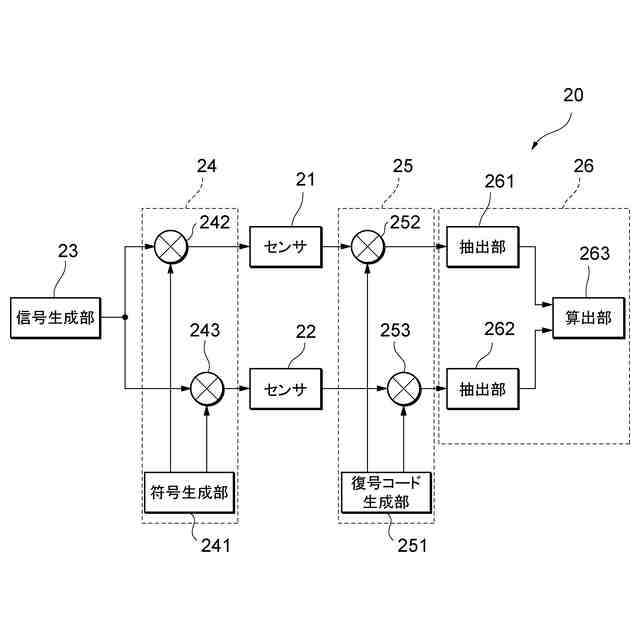 また、前記検出部は、前記復号部によって前記第1符号に従って復号された信号から前記所定の周波数を有する信号を抽出する第1抽出部と、前記復号部によって前記第2符号に従って復号された信号から前記所定の周波数を有する信号を抽出する第2抽出部と、前記第1抽出部が抽出した信号及び前記第2抽出部が抽出した信号に基づいて前記第1領域及び前記第2領域における物体の有無及び位置を算出する算出部と、を有する。