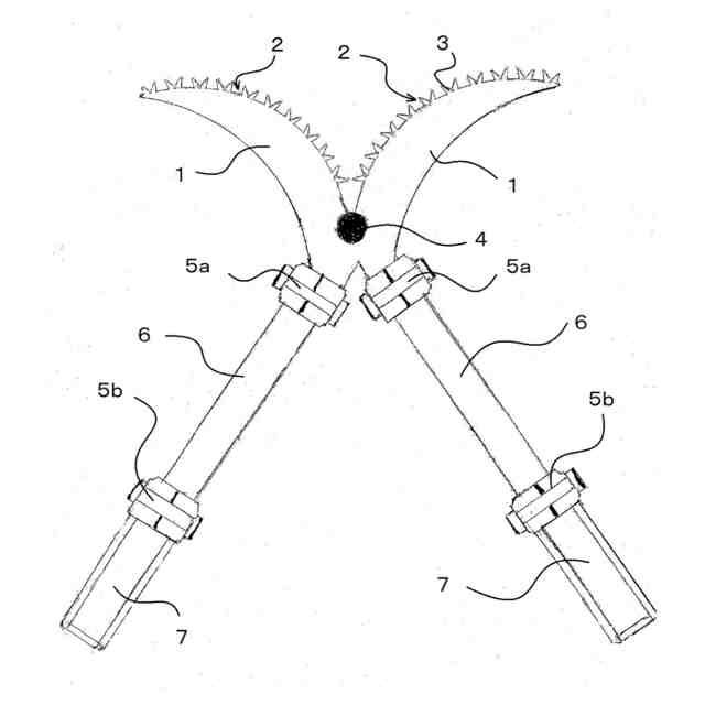 図1は本発明の草刈り鋏の外観図である。図2は本発明の草刈り鋏の側面図である。図1及び図2において、1は鉄又はステンレス鋼等の金属で形成された一対の刃体であり、刃体1の一側には刃部2を備えている。この一対の刃体1は支軸部4により刃体が開閉可能に軸支されている。また、前記刃体1は刃部2側が凸状になるように湾曲しており、刃部2には先が鋭角の2つの突起が連設し外周縁部が略М字形状の切刃3が所定間隔で複数連設されている。さらに、刃体1の基部には一対の柄部6の一端部が刃体1との角度を自由に変えられるように連結部5aにより、刃体1の開閉方向と直行する方向に回動自在に連結されており、柄部6の他端部には把持部7が角度を自由に変えられるように連結部5bにより刃体1の開閉方向と直行する方向に回動自在に連結されている。