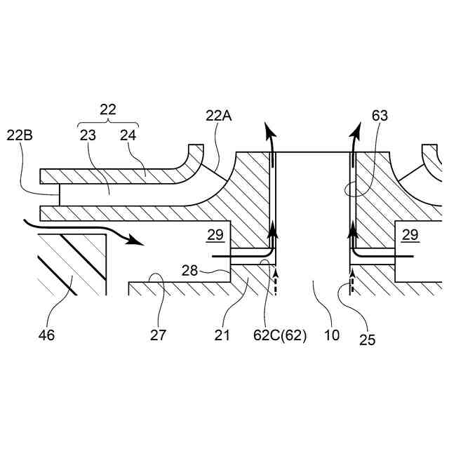 前記第2貫通孔は、前記空隙の径方向内側を通過し、前記空隙の下流側かつ前記軸受と前記支持軸との間の軸受隙間の上流側に前記キャビティを連通させる