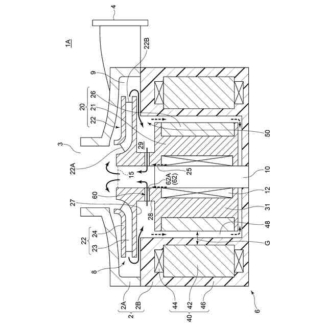リターン流路は、ロータとステータとを隔てる空隙をバイパスするように、インペラの背面側において空隙よりも内側の径方向位置に設けられるバイパス路を含む。