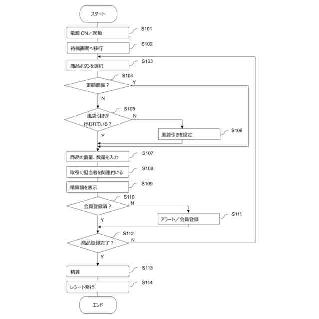 本発明の実施形態に係る商品データ処理装置によって実行される処理の流れの一例を示した処理フロー図である。