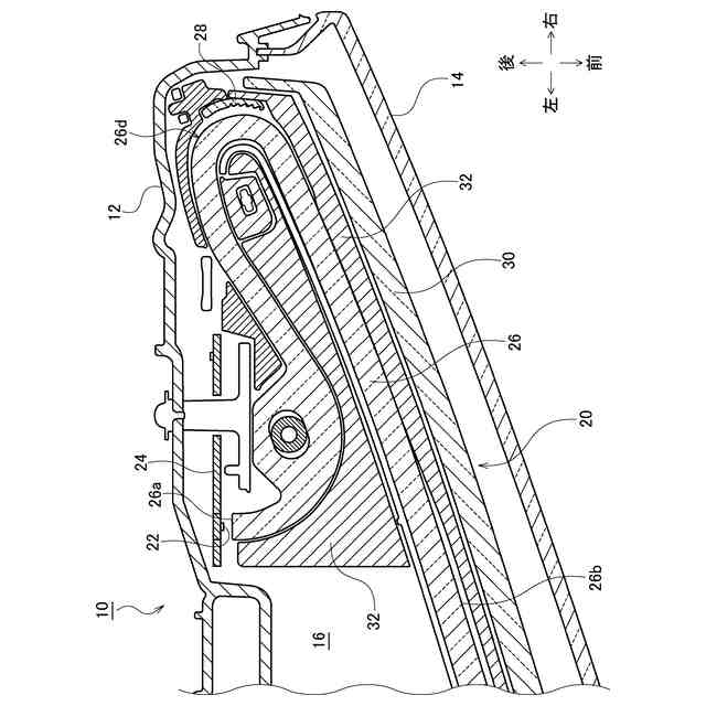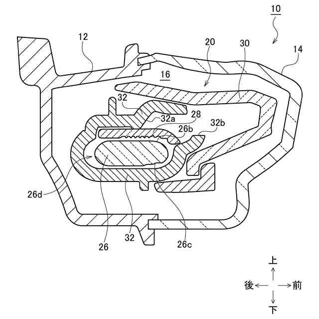 図1は、実施形態に係る車両用灯具10の概略正面図である。図1に示す車両用灯具10は、車両後部に配置されるリアコンビネーションランプである。図1に示すように、車両用灯具10は、ランプボディ12と、ランプボディ12の前面開口部を覆う透明なアウターカバー14とを備える。ランプボディ12とアウターカバー14は、灯室16を形成している。灯室16内には、灯具ユニット20が設けられている。灯具ユニット20は、図示しない支持部材によりランプボディ12に固定支持されている。灯具ユニット20は、線状の発光が得られるように構成されたものであり、例えばテールランプやストップランプとして用いることができる。しかしながら、灯具ユニット20の用途は特に限定されない。