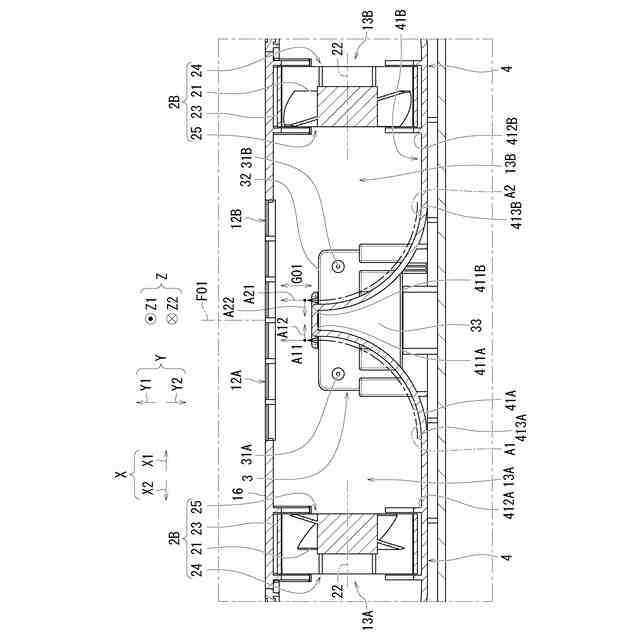 前記第一ファンは、前記第一方向において前記第一吸込口と前記第一吹出口との間に位置し、