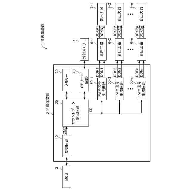 図1は、第1実施形態の半導体装置2及び音再生装置1の構成例を示す図である。図1に示すように、音再生装置1は、半導体装置2、MCU3、外部メモリー4、n個の昇圧回路6-1~6-n及びn個の音出力器7-1~7-nを備える。MCUは、Micro Controller Unitの略称である。nは2以上の整数である。