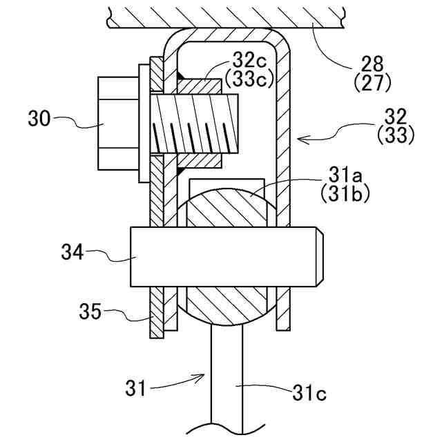 前述のように、角度設定シリンダの第1開口部と支持部(固定部)の第2開口部とに亘ってピンが挿入される構成では、ピンを抜けないように固定する必要がある。ピンの固定構造として、例えば、ピンの先端部にネジ部が形成され、ピンのネジ部にナット等の固定部材が取り付けられて、ピンが抜けないように固定される構成が考えられる。