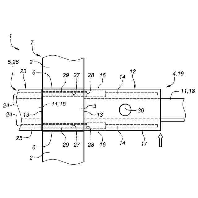第2複合構造梁105のRC部108から突出した梁主筋110が、柱梁接合部103に設けられた貫通孔111及び第1複合構造梁104のRC部106に設けられた受容孔112に挿通され、第1複合構造梁104のRC部106に埋設された継手部材113を介して、第1複合構造梁104のRC部106に埋設された梁主筋114に継がれる。