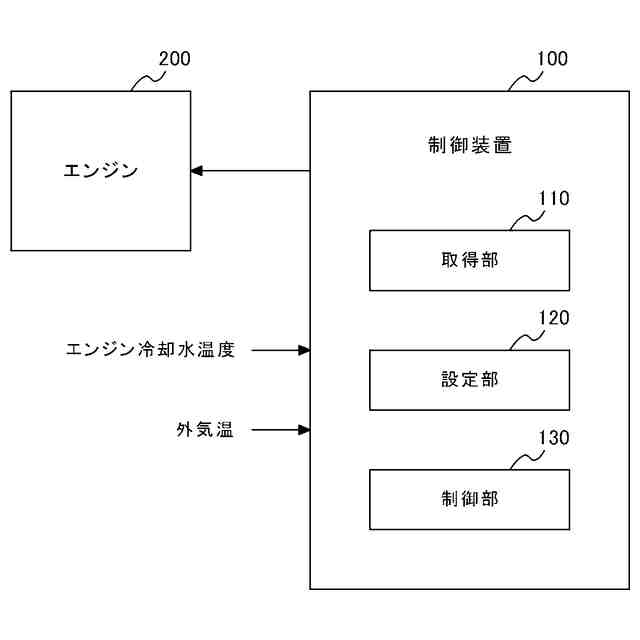 制御装置100の取得部110は、車両の周辺部の気温である外気温[℃]を取得する。この外気温は、車両に搭載された外気温センサーなど(図示せず)を用いて取得することができる。また、取得部110は、エンジン200の冷却水の温度(以下「エンジン水温」という)を取得する。このエンジン水温が、エンジン200に備えられた水温センサーなど(図示せず)を用いて取得することができる。
