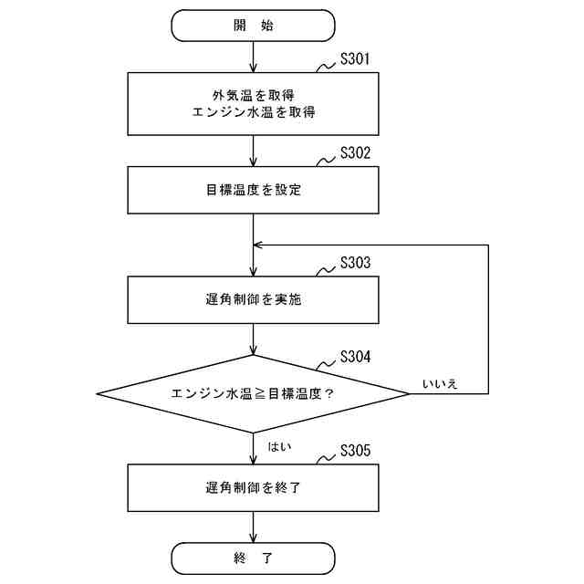 エンジン水温を目標温度まで上昇させるスピードを早くするために、エンジンの点火時期を遅らせる遅角制御を実施する車両が存在する。一般的に、外気温が低くければ低いほど、エンジン水温の高温域まで点火時期を遅角させたい。しかしながら、この遅角制御では、制御が終了となるヒーターコアの目標温度が、外気温に依らず一定のエンジン水温で設定されている。このため、遅角制御の終了タイミングが外気温に応じて最適化されていないという課題がある。