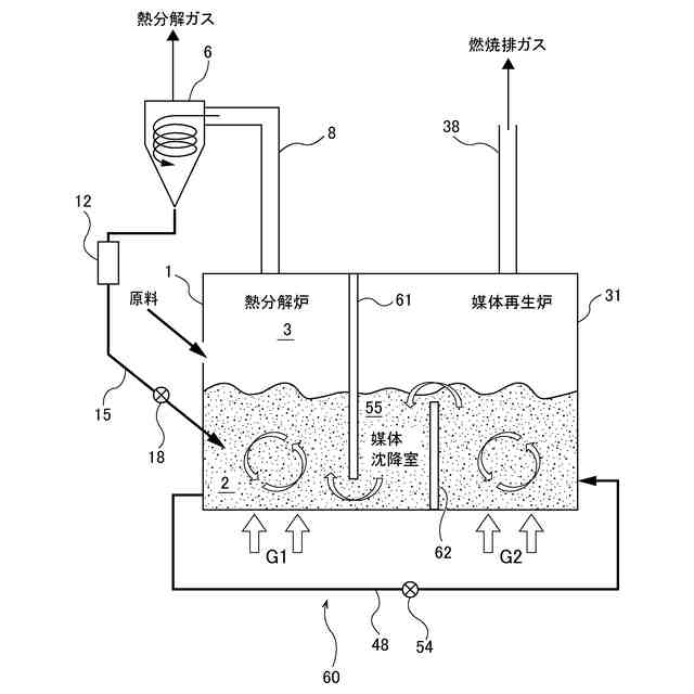 一方、熱分解生成物の組成は、原料と温度と滞留時間により主に支配される。廃プラスチックなどの廃棄物を原料とする場合、原料中には雑多な化合物が含まれる。このため、熱分解によって得られる生成物も多様になり、化学原料としての価値が低下する。そこで、温度と滞留時間を制御することで、生成物の組成を制御することが求められる。熱分解炉は、流動媒体を濃厚に含む濃厚層と、その濃厚層の上方にある流動媒体と多量のガスが共存するスプラッシュゾーンと、スプラッシュゾーンの上方で流動媒体をほとんど含まずガスを主体とするフリーボードで構成される。熱分解温度を制御する場合は、熱分解炉の濃厚層の温度を制御する。濃厚層の温度制御は、主に媒体再生炉から熱分解炉への熱の移動量、つまり流動媒体の循環量を調整することで達成できる。滞留時間の制御は、熱分解炉への流動化ガスの供給量を変化させることで達成できる。