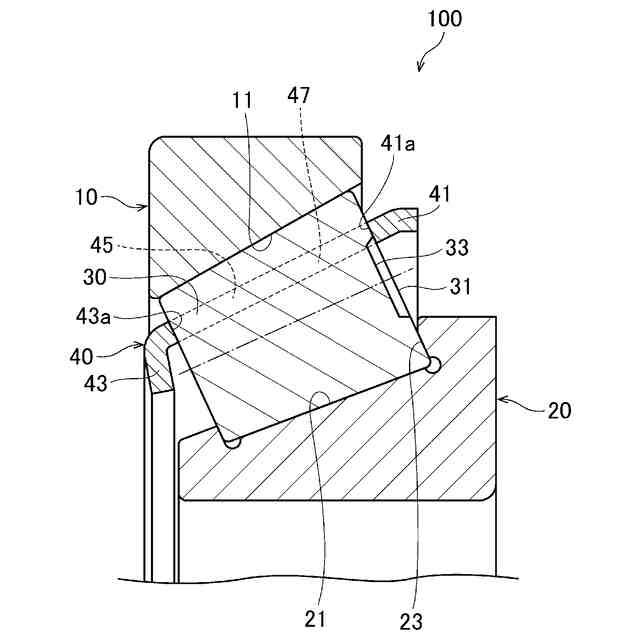 図5は、従来例に係る円すいころ軸受を示す断面図である。図5に示すように、円すいころ軸受100は、内周面に外輪軌道面11を有する外輪10と、外周面に内輪軌道面21を有する内輪20と、外輪軌道面11と内輪軌道面21との間に転動可能に設けられる複数の円すいころ30と、複数の円すいころ30を周方向に略等間隔に保持する保持器40と、を備える。