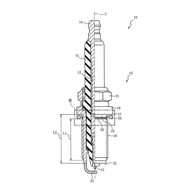 絶縁体の外周に配置され先端から後端側へ中心線に沿って延びる主体金具と、