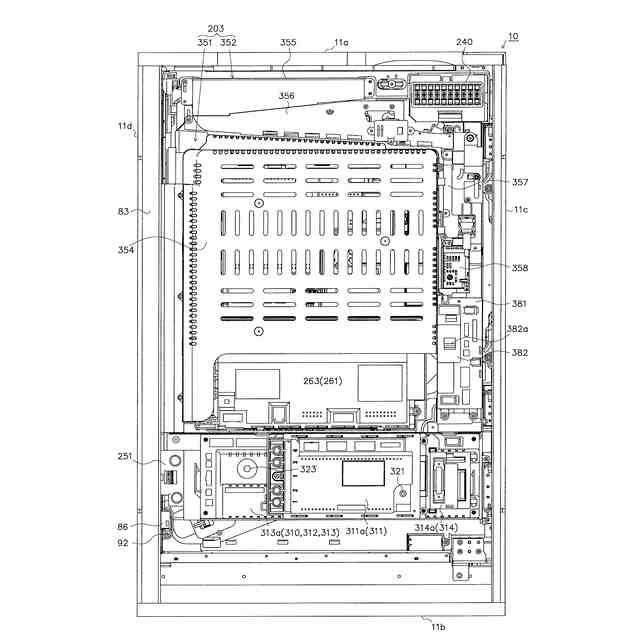 以下、パチンコ遊技機(以下、単に「パチンコ機」という)の一実施形態を、図面に基づいて詳細に説明する。図3等に示すように、パチンコ機10は、当該パチンコ機10の外郭を構成する固定枠としての外枠11を備えており、この外枠11の一側部に遊技盤取付枠としての内枠12が開閉可能に支持されている。尚、図3では便宜上、遊技盤30面上に配設される遊技部材(釘や役物等)、前枠としての前面枠14に取付けられるガラスユニット137等を省略して示している。