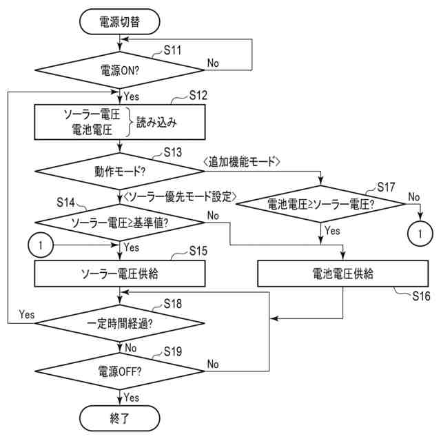 【解決手段】追加機能を使用しないソーラー優先モードではソーラー優先Piを表示させ、ソーラー電圧Vsが電卓機能最低動作電圧の電卓基準値以上あればソーラー電源ESを供給してソーラー供給ありSiHを表示させ、電卓基準値未満であれば電池電源EBを供給してソーラー供給なしSiL、電池電圧残量Biを表示させる。追加機能を使用する追加機能モードではソーラー優先Piを非表示とし、電池電圧Vbが追加機能最低動作電圧である第2基準値以上あれば電池電源EBを供給して追加機能動作可CiD、電池電圧残量(高)BiHまたは(中)BiMを表示させる。電池電圧Vbが第2基準値未満であれば追加機能動作不可CiE、電池電圧残量(低)BiLまたは(無し)BiEを表示させる。