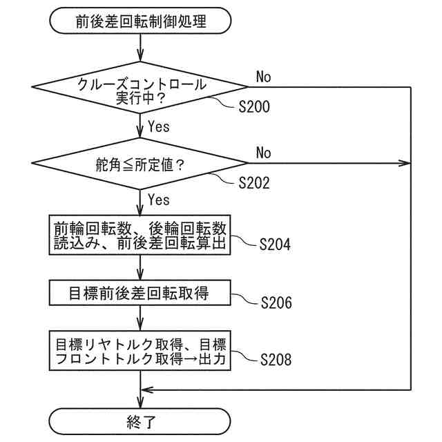 該前後差回転の学習後、クルーズコントロール中であり、かつ、舵角が所定値以下の場合に、実前後差回転が学習した前後差回転と一致するように、前記フロント電動モータ、及び、前記リヤ電動モータそれぞれの出力トルクを制御する