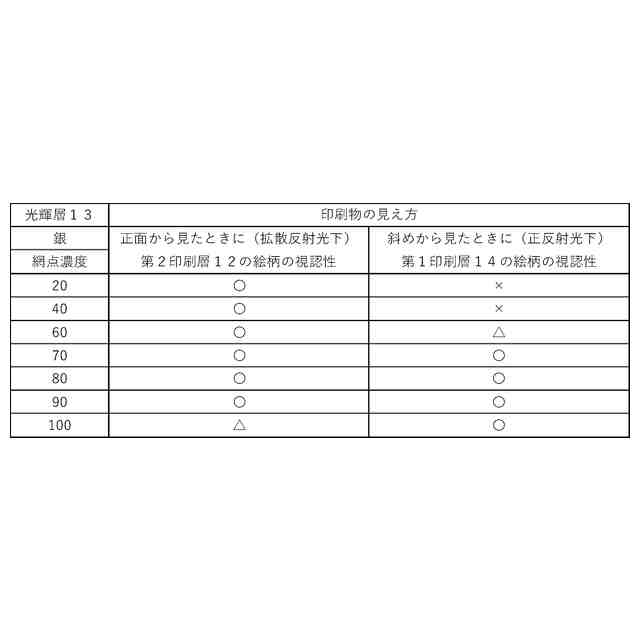 第2の開示は、第1の開示に記載の印刷物(1、1B、1C)において、前記光輝層(13、13B、13C)は、目視で視認不可能な網点又は万線により一様に形成されていること、を特徴とする印刷物(1、1B、1C)である。